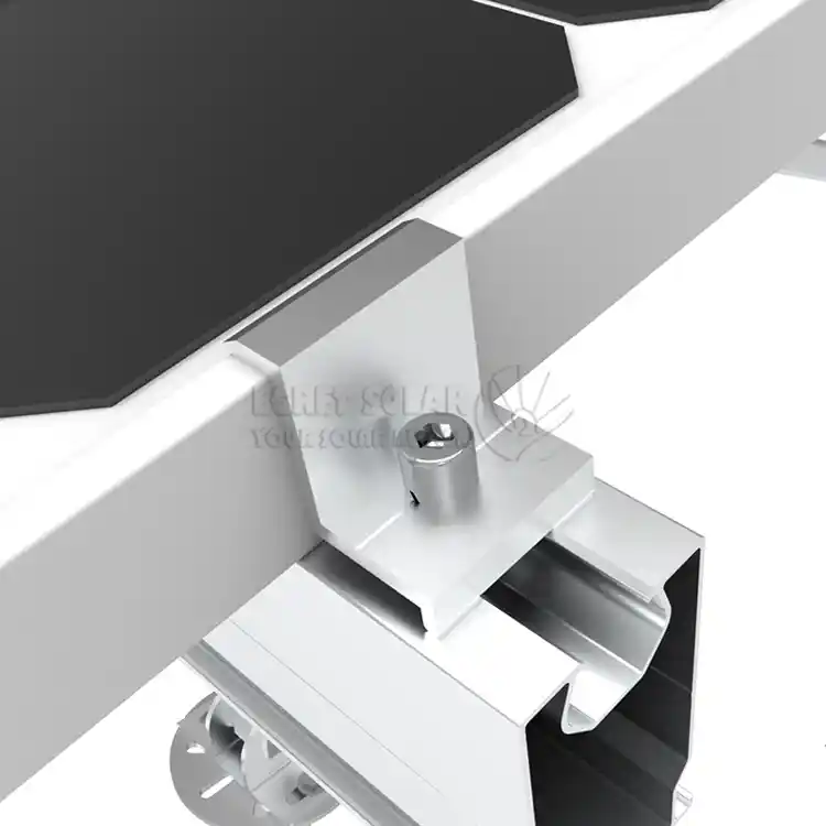braçadeira final solarfixa a moldura do componente mais externo de cada fileira na extremidade do trilho para evitar que escorregue. Ao mesmo tempo, pressionar as bordas dos componentes ajuda a reduzir a invasão de vento, chuva e poeira pelas laterais. Ele está localizado na borda da matriz e suporta diretamente a força de elevação do vento mais forte (força de tração para cima) e a força de sucção do vento. É um ponto chave de sustentação de força no design resistente ao vento e deve ter resistência mecânica suficiente.
