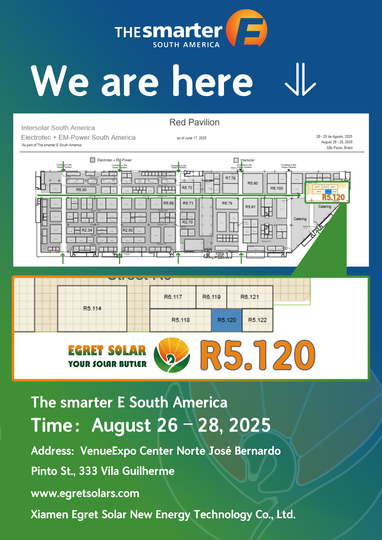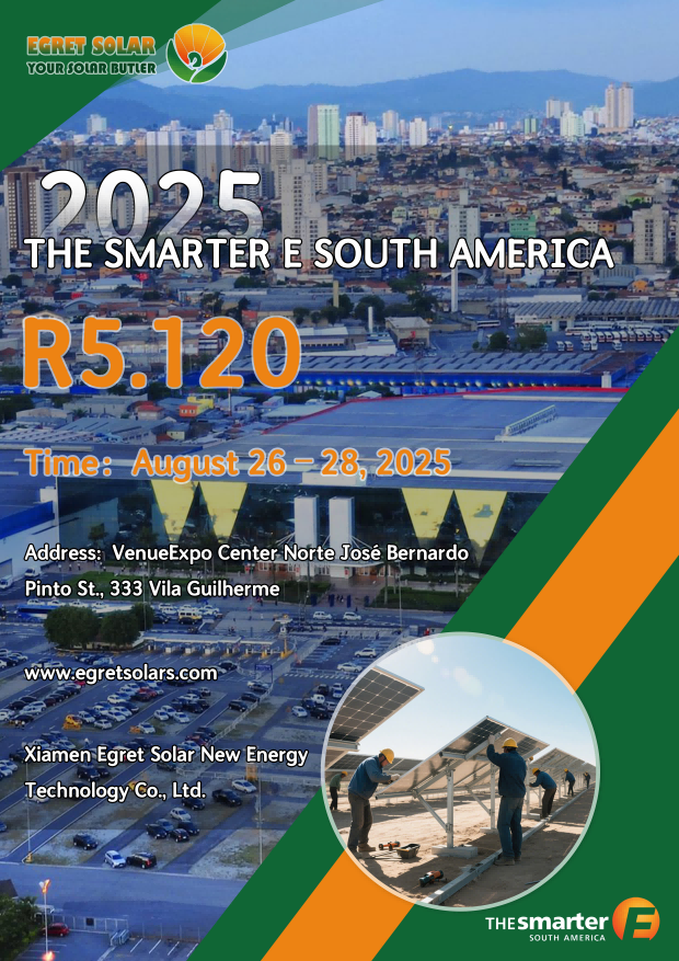 Como um jogador -chave no novo setor de energia,XIAMEN EGRET Solar New Energy Technology Co., Ltd.mostrará seus principais produtos e soluções técnicas na exposição mais inteligente da América do Sul 2025 no Brasil de 26 a 28 de agosto de 2025, para discutir o desenvolvimento e a cooperação do mercado de novas energia da América do Sul com parceiros da indústria global.