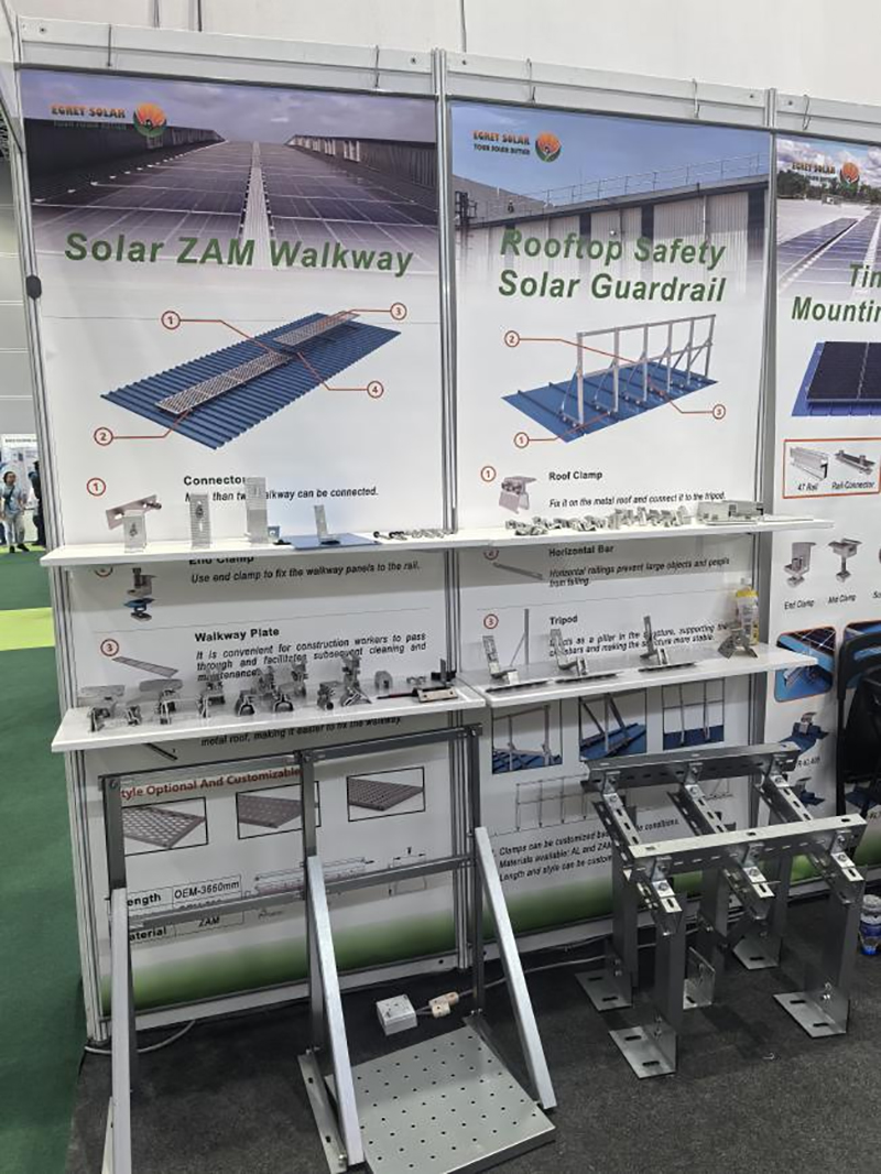 Na exposição, apresentamos vários acessórios para telhados, incluindo grampos, ganchos e pés em L. Os clientes podem escolher diferentes combinações com base no ambiente de instalação. Grampos ou pés em L são usados para telhas de aço com revestimento colorido, enquanto ganchos solares para telhas são usados para telhas cerâmicas. Também podemos personalizar os grampos com base no modelo de telha de aço com revestimento colorido do cliente ou estender o braço do gancho para se adequar ao uso no local.